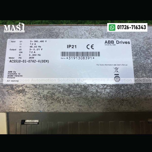 The ABB 3kW 3-Phase Variable Frequency Drive (VFD), model ACS510-01-07A2-4, is a robust and reliable AC motor speed controller offered by Multipurpose Automation Solution in Gazipur, Dhaka Division, Bangladesh. As part of ABB’s popular ACS510 series, this drive provides efficient and versatile motor control for a wide range of industrial applications.