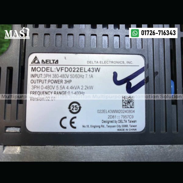 The DELTA VFD-EL Series 2.2kW 3-Phase Variable Frequency Drive (VFD), model VFD022EL43W, is a compact and cost-effective AC motor speed controller offered by Multipurpose Automation Solution in Gazipur, Dhaka Division, Bangladesh. As part of Delta’s popular VFD-EL series, this drive provides reliable and efficient motor control for a wide range of industrial applications.