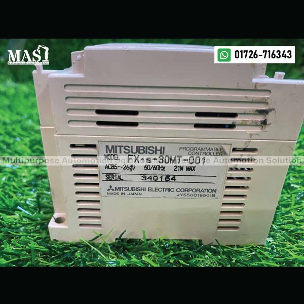 The MITSUBISHI PLC FX1S-30MT-001 is a compact and reliable Programmable Logic Controller (PLC) offered by Multipurpose Automation Solution in Gazipur, Dhaka Division, Bangladesh. As a fundamental unit in the well-established FX series from Mitsubishi Electric, this PLC provides a cost-effective solution for basic to intermediate control applications with a higher I/O count.