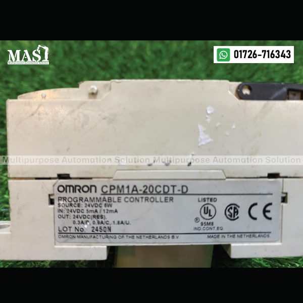 The OMRON PLC CPM1A-20CDT-D is a compact and reliable Micro Programmable Logic Controller (PLC) offered by Multipurpose Automation Solution in Gazipur, Dhaka Division, Bangladesh. As part of the well-established CPM1A series from Omron, this PLC provides a cost-effective solution for basic to intermediate control applications. The “-D” suffix typically indicates a DC power supply. The “CDT” designation signifies transistor (sinking) outputs.