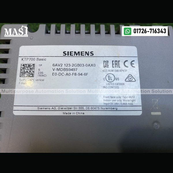 The Siemens KTP700 Basic HMI (Model: 6AV2 123-2GB03-0AX0) is available at Multipurpose Automation Solution for the competitive price of 30,000 Taka. Contact us today to place your order or to learn more about our comprehensive range of automation products and services.